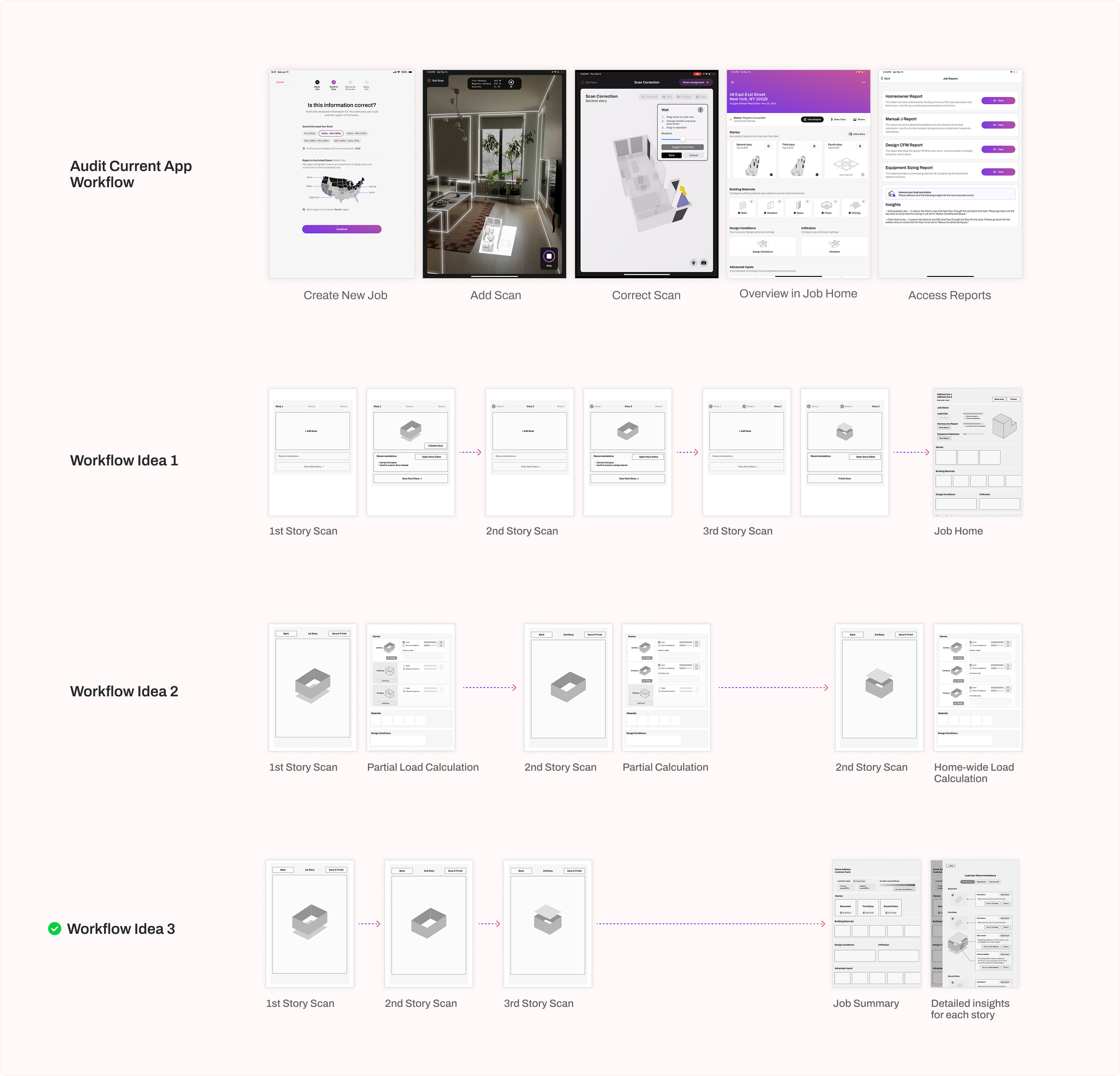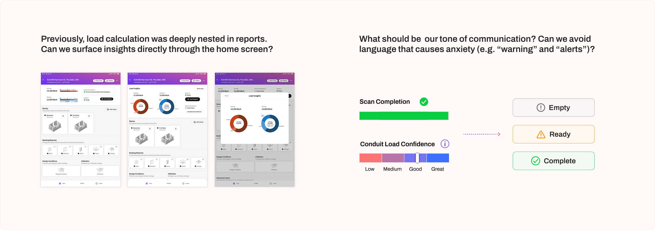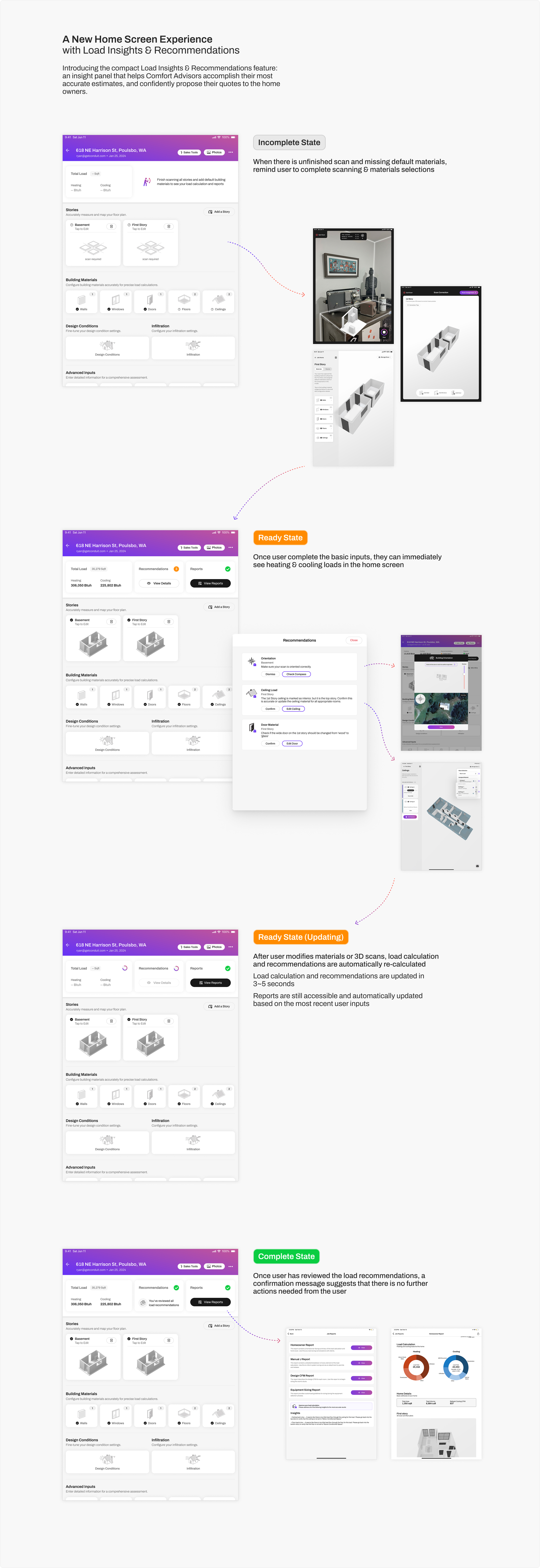 The final design is a compact and efficient load summary panel at the top of each project's home page ("Job Home"). It give users the most essential insights into their job status and load calculation values, will providing easy access to view and act on recommendations that will further improve their load calculation accuracy.