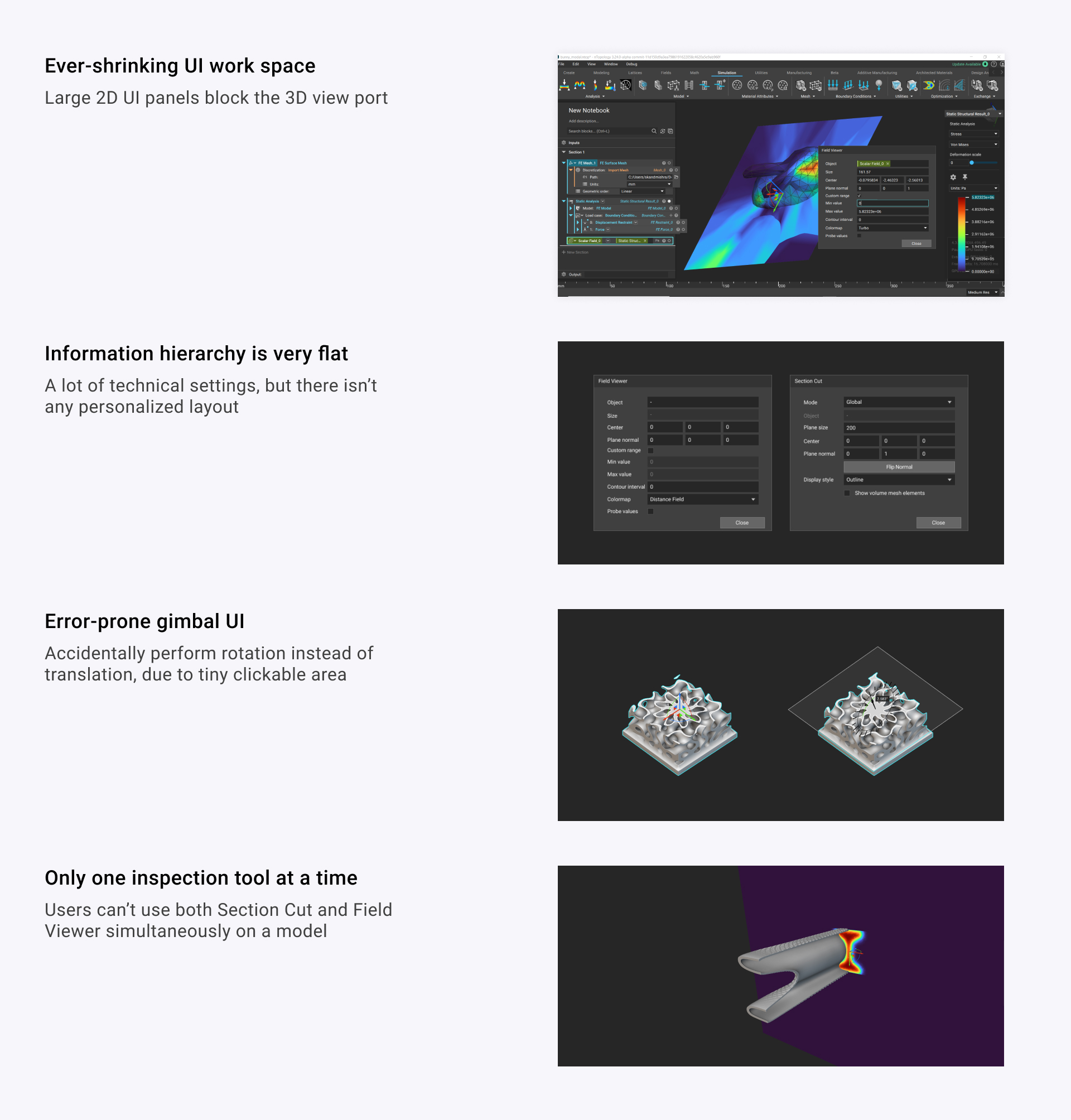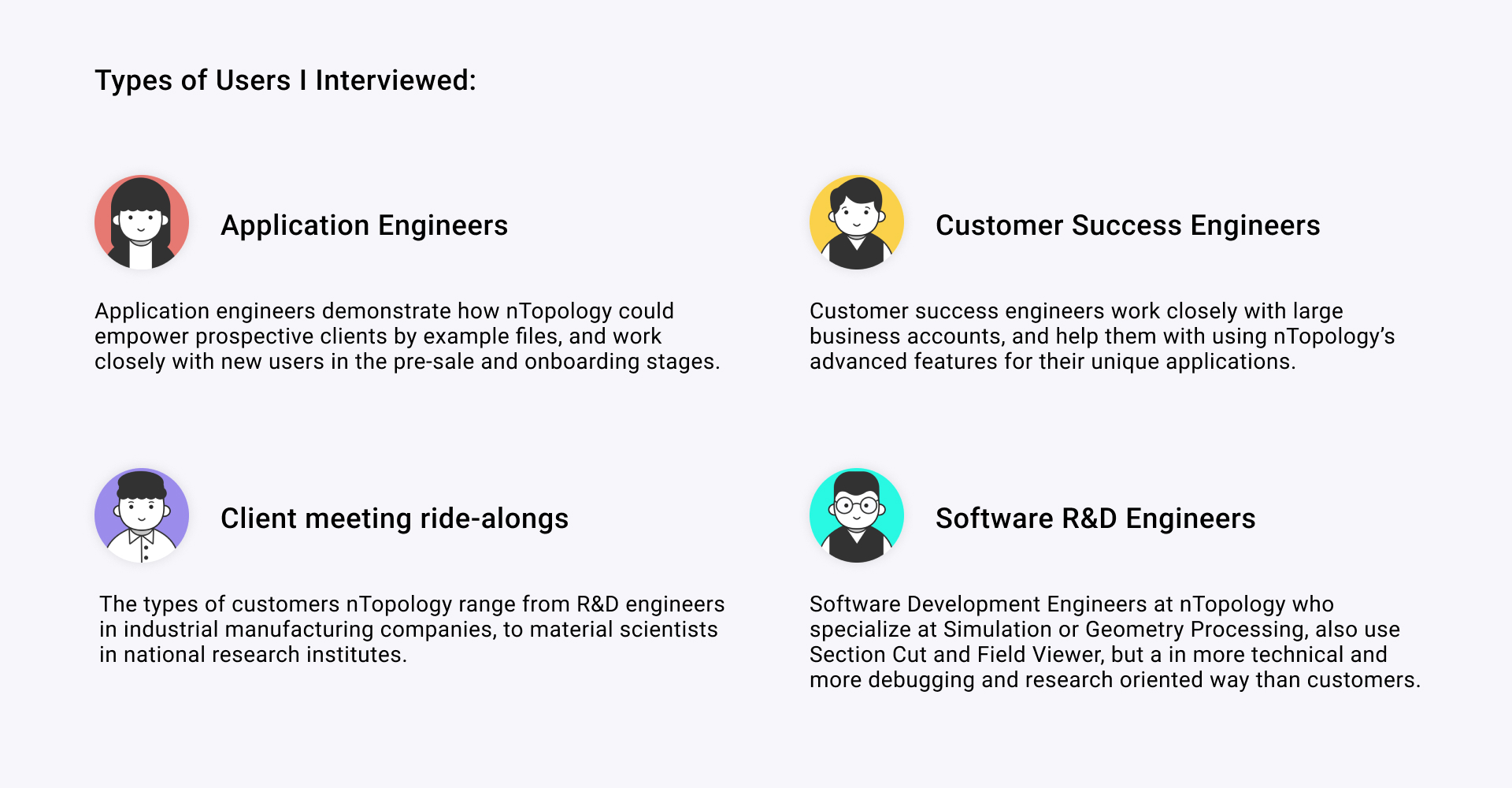 After initial round of assumption validation and feedback gathering, I then talked to people from each of the 4 main user groups, observed their usage of nTopology in action, and gathered more qualitative feedback.