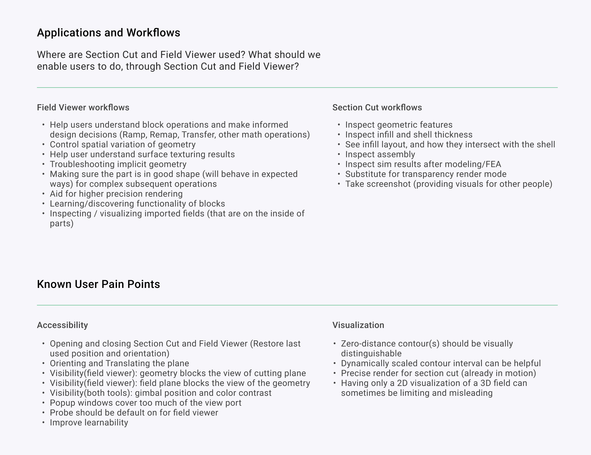 I sat down with internal users in either individual or group meetings, depending on each person's schedules, and I gathered feedback from nTopology's clients by riding along existing weekly or biweekly product support meetings they have with nTopology.