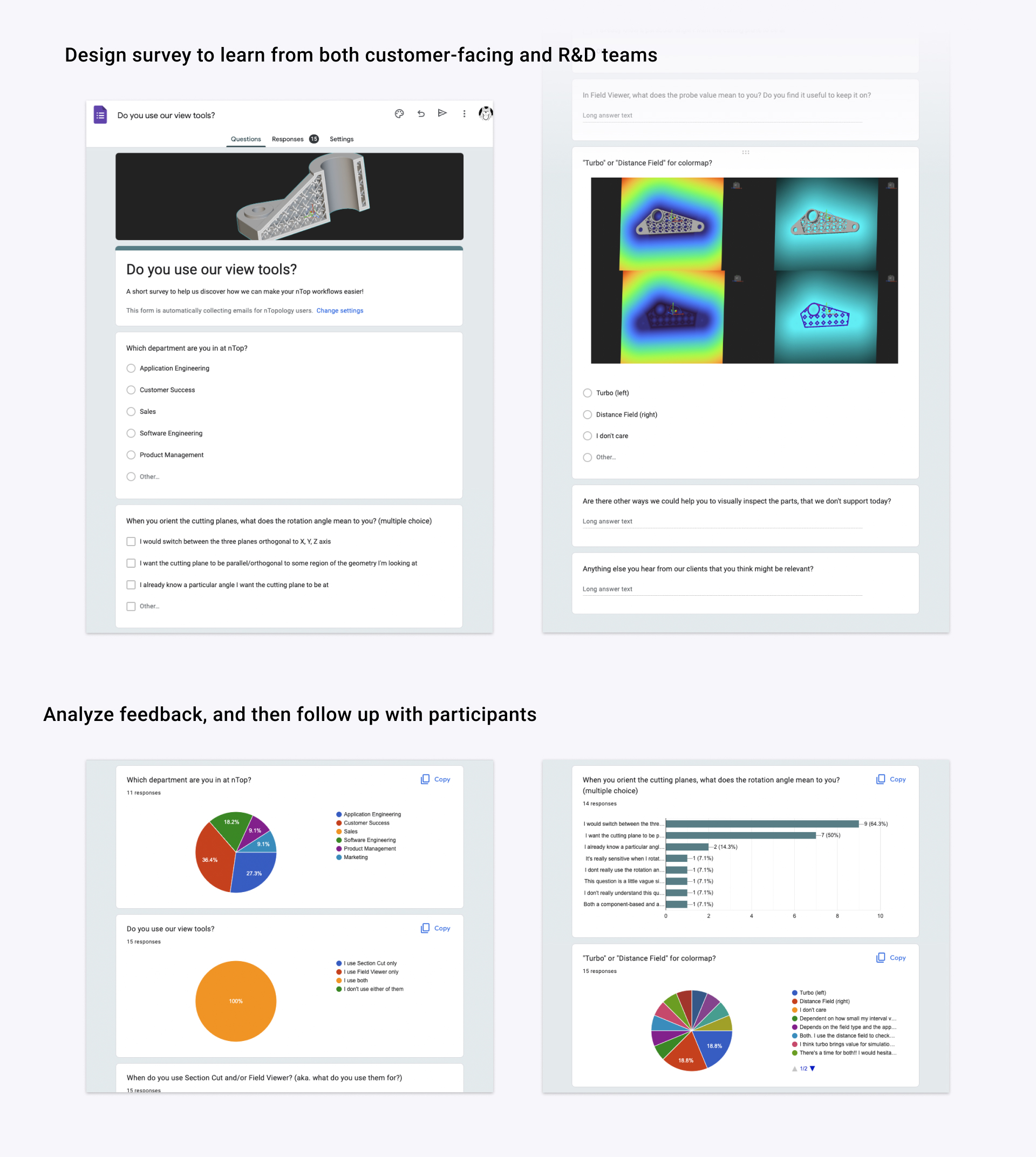 To validate initial assumptions, I designed a survey for nTopology's internal users, with an emphasis on people who are in customer-facing roles.