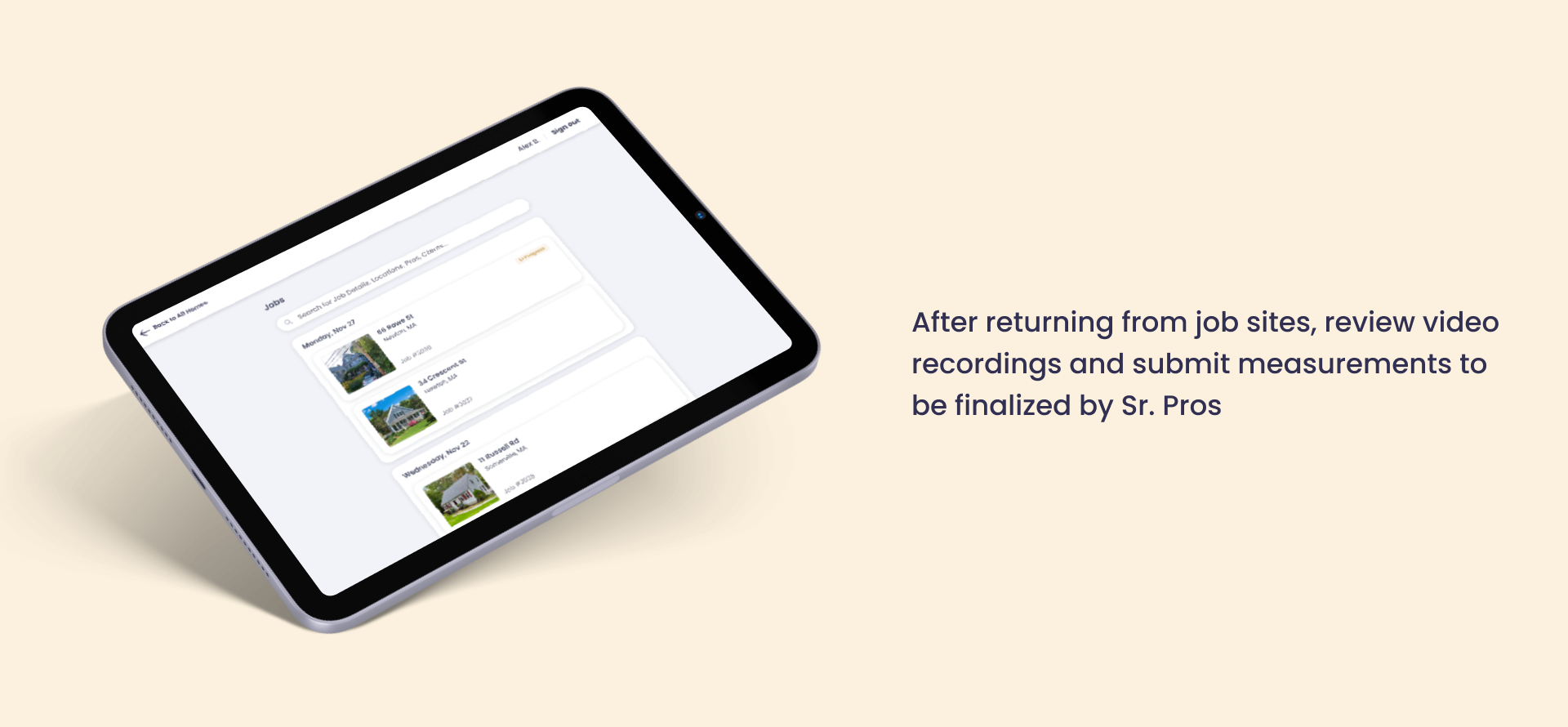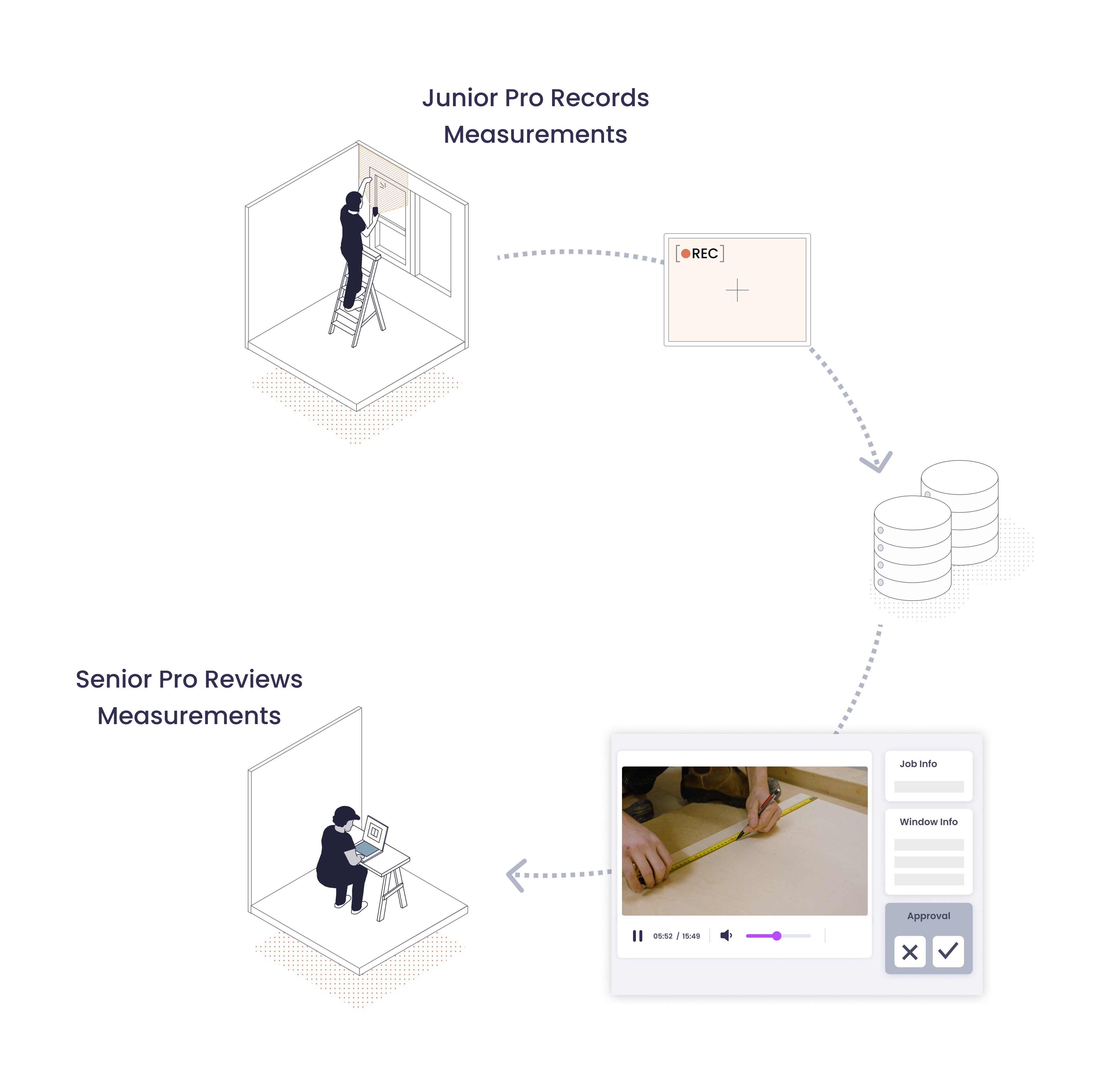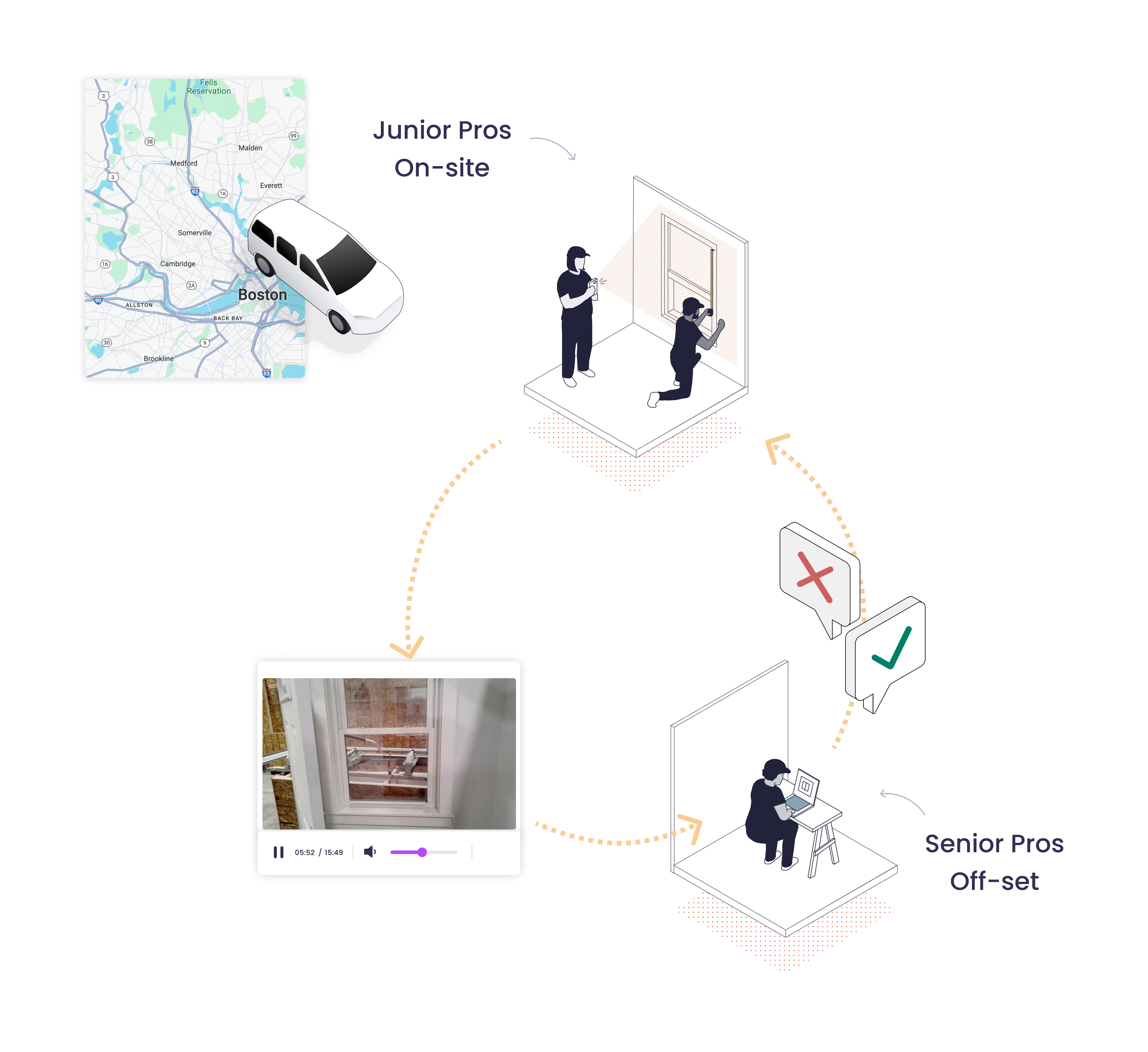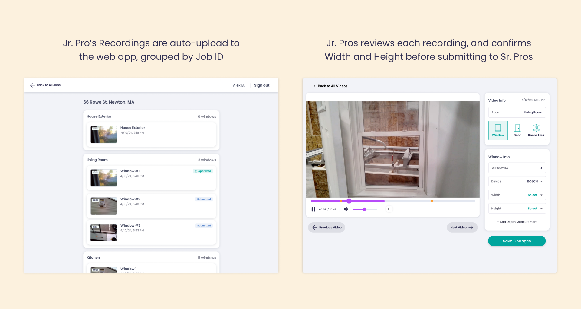 For Junior Pros to measure windows, they need to travel to the job sites on their own, where they are expected to: tour the client’s house, video-capture how each window is measured, answer any questions from the clients at the same time: